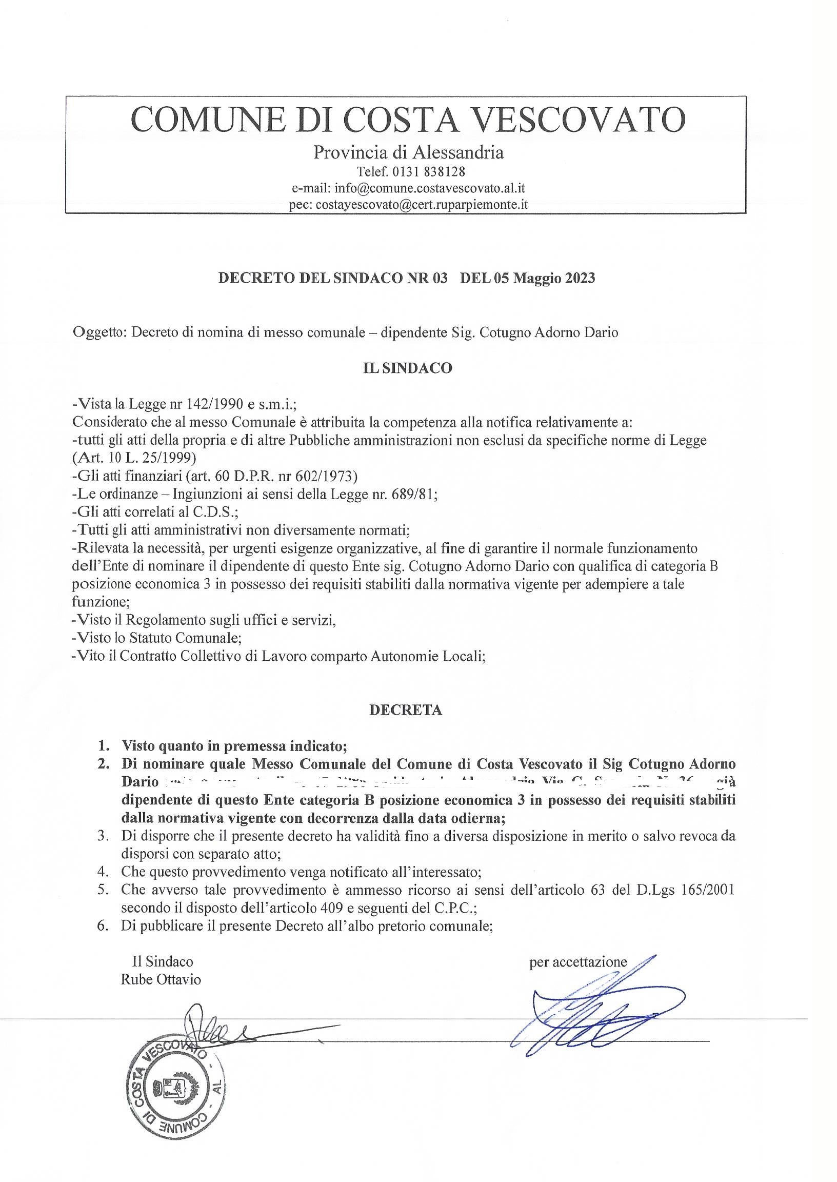 | Descrizione | decreto di nomina a messo comunale Cotugno Adorno Dario |